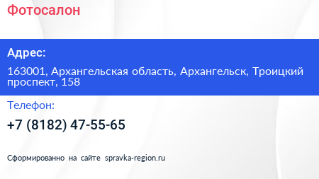 Фотосалон по адресу 163001, Архангельская область, Архангельск, Троицкий проспект, 158 в дальнейшем Организация, размещена в следующих категориях: