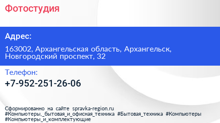 Фотостудия по адресу 163002, Архангельская область, Архангельск, Новгородский проспект, 32 в дальнейшем Организация, размещена в следующих категориях: