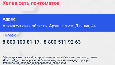 Халва, сеть почтоматов по адресу Архангельская область, Архангельск, Дачная, 44 в дальнейшем Организация, размещена в следующих категориях: