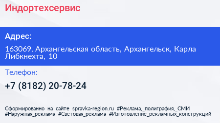 Индортехсервис по адресу 163069, Архангельская область, Архангельск, Карла Либкнехта, 10 в дальнейшем Организация, размещена в следующих категориях: