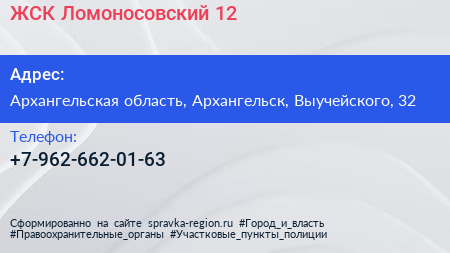 ЖСК Ломоносовский-12 по адресу Архангельская область, Архангельск, Выучейского, 32 в дальнейшем Организация, размещена в следующих категориях: