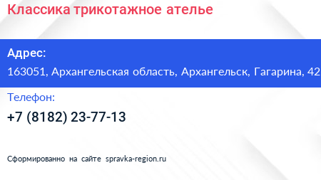 Классика, трикотажное ателье по адресу 163051, Архангельская область, Архангельск, Гагарина, 42 в дальнейшем Организация, размещена в следующих категориях: