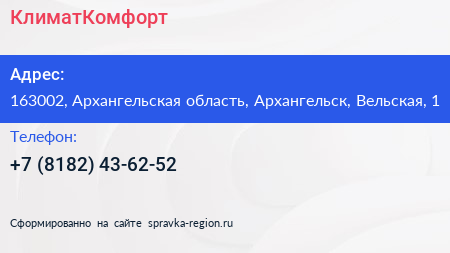 КлиматКомфорт по адресу 163002, Архангельская область, Архангельск, Вельская, 1 в дальнейшем Организация, размещена в следующих категориях: