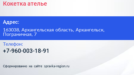 Кокетка, ателье по адресу 163038, Архангельская область, Архангельск, Пограничная, 7 в дальнейшем Организация, размещена в следующих категориях: