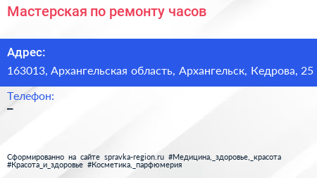 Мастерская по ремонту часов по адресу 163013, Архангельская область, Архангельск, Кедрова, 25 в дальнейшем Организация, размещена в следующих категориях: