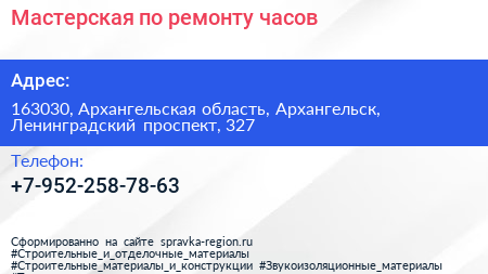 Мастерская по ремонту часов по адресу 163030, Архангельская область, Архангельск, Ленинградский проспект, 327 в дальнейшем Организация, размещена в следующих категориях: