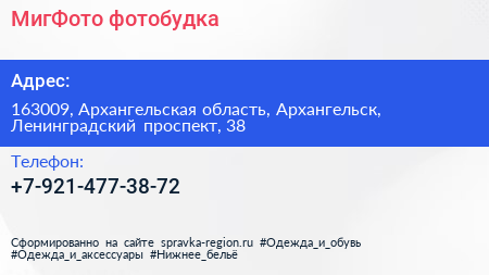 МигФото, фотобудка по адресу 163009, Архангельская область, Архангельск, Ленинградский проспект, 38 в дальнейшем Организация, размещена в следующих категориях: