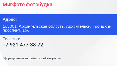 МигФото, фотобудка по адресу 163001, Архангельская область, Архангельск, Троицкий проспект, 166 в дальнейшем Организация, размещена в следующих категориях:
