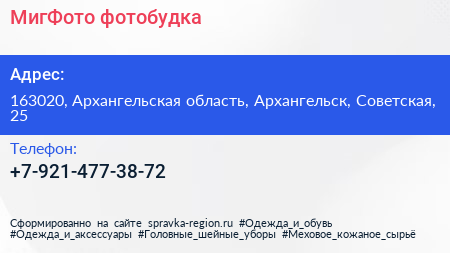 МигФото, фотобудка по адресу 163020, Архангельская область, Архангельск, Советская, 25 в дальнейшем Организация, размещена в следующих категориях: