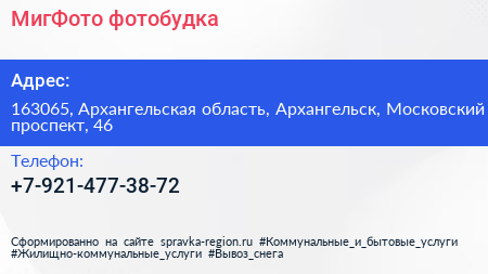МигФото, фотобудка по адресу 163065, Архангельская область, Архангельск, Московский проспект, 46 в дальнейшем Организация, размещена в следующих категориях: