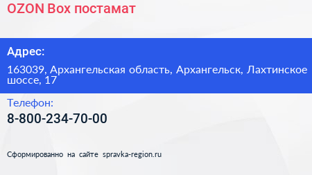 OZON Box, постамат по адресу 163039, Архангельская область, Архангельск, Лахтинское шоссе, 17 в дальнейшем Организация, размещена в следующих категориях: