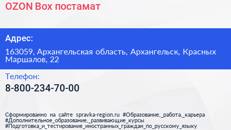 OZON Box, постамат по адресу 163059, Архангельская область, Архангельск, Красных Маршалов, 22 в дальнейшем Организация, размещена в следующих категориях: