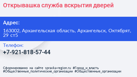 Открывашка, служба вскрытия дверей по адресу 163002, Архангельская область, Архангельск, Октябрят, 29 ст5 в дальнейшем Организация, размещена в следующих категориях: