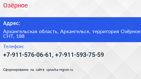 Озёрное по адресу Архангельская область, Архангельск, территория Озёрное СНТ, 188 в дальнейшем Организация, размещена в следующих категориях: