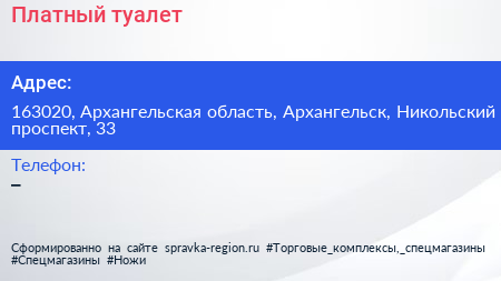 Платный туалет по адресу 163020, Архангельская область, Архангельск, Никольский проспект, 33 в дальнейшем Организация, размещена в следующих категориях: