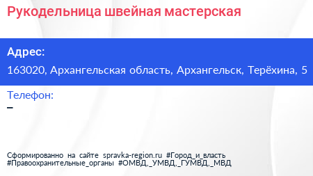 Рукодельница, швейная мастерская по адресу 163020, Архангельская область, Архангельск, Терёхина, 5 в дальнейшем Организация, размещена в следующих категориях: