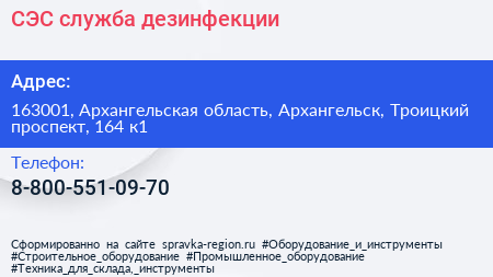 СЭС, служба дезинфекции по адресу 163001, Архангельская область, Архангельск, Троицкий проспект, 164 к1 в дальнейшем Организация, размещена в следующих категориях: