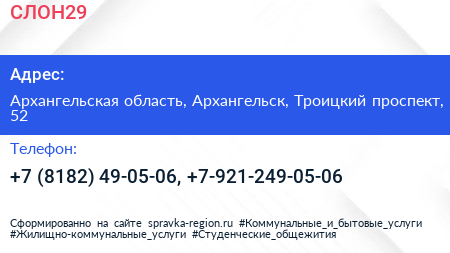 СЛОН29 по адресу Архангельская область, Архангельск, Троицкий проспект, 52 в дальнейшем Организация, размещена в следующих категориях: