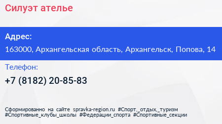Силуэт, ателье по адресу 163000, Архангельская область, Архангельск, Попова, 14 в дальнейшем Организация, размещена в следующих категориях: