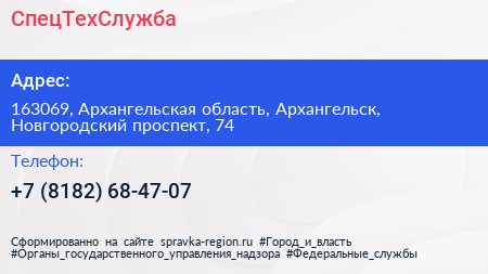 СпецТехСлужба по адресу 163069, Архангельская область, Архангельск, Новгородский проспект, 74 в дальнейшем Организация, размещена в следующих категориях: