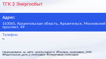 ТГК-2 Энергосбыт по адресу 163065, Архангельская область, Архангельск, Московский проспект, 49 в дальнейшем Организация, размещена в следующих категориях: