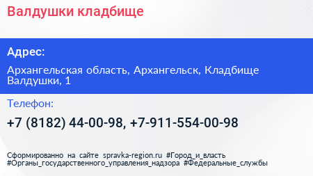 Валдушки, кладбище по адресу Архангельская область, Архангельск, Кладбище Валдушки, 1 в дальнейшем Организация, размещена в следующих категориях: