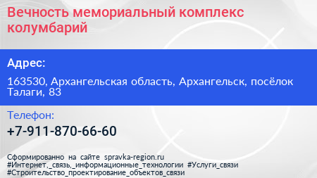 Вечность, мемориальный комплекс-колумбарий по адресу 163530, Архангельская область, Архангельск, посёлок Талаги, 83 в дальнейшем Организация, размещена в следующих категориях: