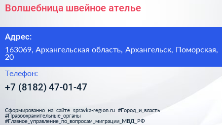 Волшебница, швейное ателье по адресу 163069, Архангельская область, Архангельск, Поморская, 20 в дальнейшем Организация, размещена в следующих категориях: