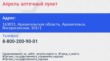 Апрель, аптечный пункт по адресу 163051, Архангельская область, Архангельск, Воскресенская, 101/1 в дальнейшем Организация, размещена в следующих категориях: