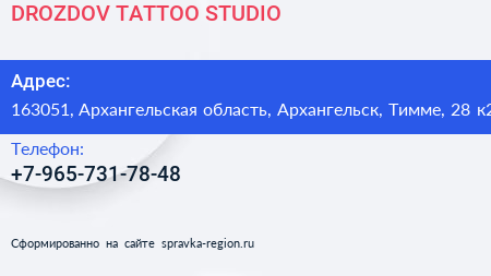 DROZDOV TATTOO STUDIO по адресу 163051, Архангельская область, Архангельск, Тимме, 28 к2 в дальнейшем Организация, размещена в следующих категориях: