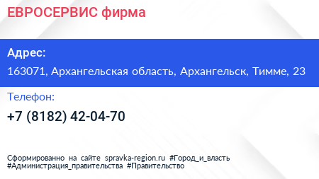 ЕВРОСЕРВИС, фирма по адресу 163071, Архангельская область, Архангельск, Тимме, 23 в дальнейшем Организация, размещена в следующих категориях: