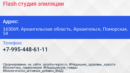 Flash, студия эпиляции по адресу 163069, Архангельская область, Архангельск, Поморская, 54 в дальнейшем Организация, размещена в следующих категориях: