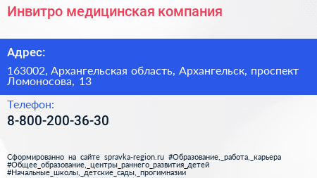 Инвитро, медицинская компания по адресу 163002, Архангельская область, Архангельск, проспект Ломоносова, 13 в дальнейшем Организация, размещена в следующих категориях: