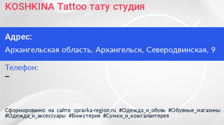 KOSHKINA Tattoo, тату-студия по адресу Архангельская область, Архангельск, Северодвинская, 9 в дальнейшем Организация, размещена в следующих категориях: