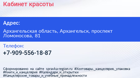 Кабинет красоты по адресу Архангельская область, Архангельск, проспект Ломоносова, 81 в дальнейшем Организация, размещена в следующих категориях: