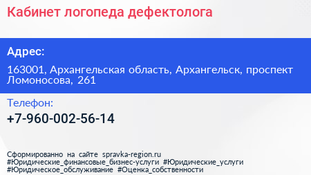 Кабинет логопеда-дефектолога по адресу 163001, Архангельская область, Архангельск, проспект Ломоносова, 261 в дальнейшем Организация, размещена в следующих категориях: