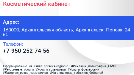 Косметический кабинет по адресу 163000, Архангельская область, Архангельск, Попова, 24 к1 в дальнейшем Организация, размещена в следующих категориях:
