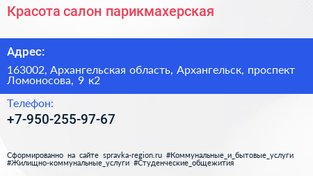 Красота, салон-парикмахерская по адресу 163002, Архангельская область, Архангельск, проспект Ломоносова, 9 к2 в дальнейшем Организация, размещена в следующих категориях: