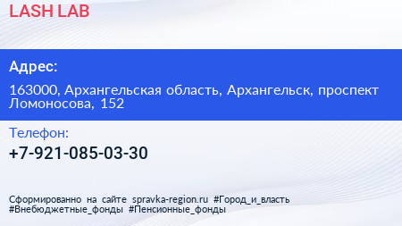 LASH LAB по адресу 163000, Архангельская область, Архангельск, проспект Ломоносова, 152 в дальнейшем Организация, размещена в следующих категориях: