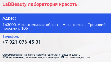LaBBeauty, лаборатория красоты по адресу 163000, Архангельская область, Архангельск, Троицкий проспект, 106 в дальнейшем Организация, размещена в следующих категориях: