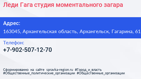 Леди Гага, студия моментального загара по адресу 163045, Архангельская область, Архангельск, Гагарина, 61 в дальнейшем Организация, размещена в следующих категориях: