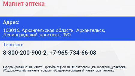 Магнит, аптека по адресу 163016, Архангельская область, Архангельск, Ленинградский проспект, 390 в дальнейшем Организация, размещена в следующих категориях: