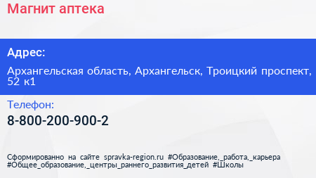 Магнит, аптека по адресу Архангельская область, Архангельск, Троицкий проспект, 52 к1 в дальнейшем Организация, размещена в следующих категориях: