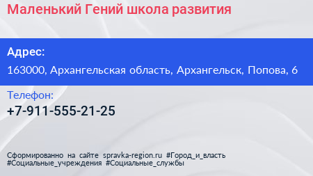 Маленький Гений, школа развития по адресу 163000, Архангельская область, Архангельск, Попова, 6 в дальнейшем Организация, размещена в следующих категориях:
