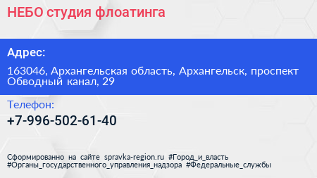 НЕБО, студия флоатинга по адресу 163046, Архангельская область, Архангельск, проспект Обводный канал, 29 в дальнейшем Организация, размещена в следующих категориях: