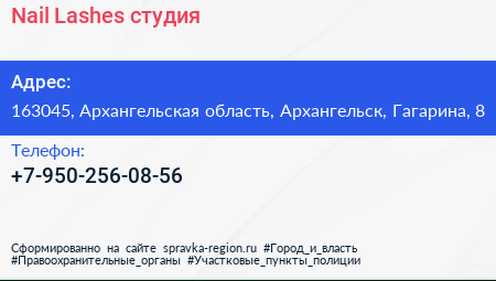 Nail & Lashes, студия по адресу 163045, Архангельская область, Архангельск, Гагарина, 8 в дальнейшем Организация, размещена в следующих категориях: