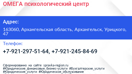 ОМЕГА, психологический центр по адресу 163060, Архангельская область, Архангельск, Урицкого, 47 в дальнейшем Организация, размещена в следующих категориях: