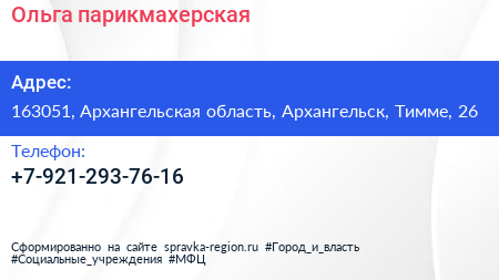 Ольга, парикмахерская по адресу 163051, Архангельская область, Архангельск, Тимме, 26 в дальнейшем Организация, размещена в следующих категориях: