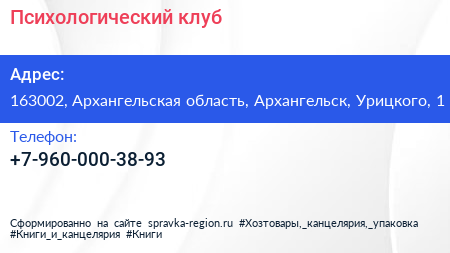 Психологический клуб по адресу 163002, Архангельская область, Архангельск, Урицкого, 1 в дальнейшем Организация, размещена в следующих категориях: