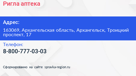 Ригла, аптека по адресу 163069, Архангельская область, Архангельск, Троицкий проспект, 17 в дальнейшем Организация, размещена в следующих категориях: